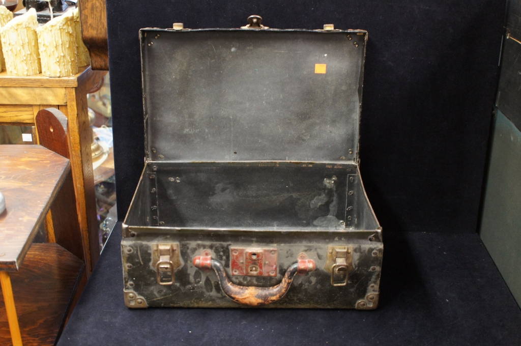 Todds now. item was paid and then got returned....1 Rare Vintage Antique Metal & Leather Handle Suitcase w/ Lock Great Display