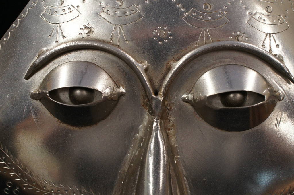 Incredible Rare Metal Sculpture Face Mask Display On Stand Etched Designs 15.5