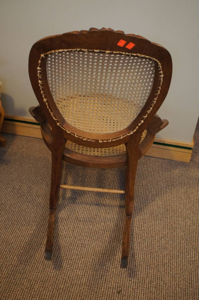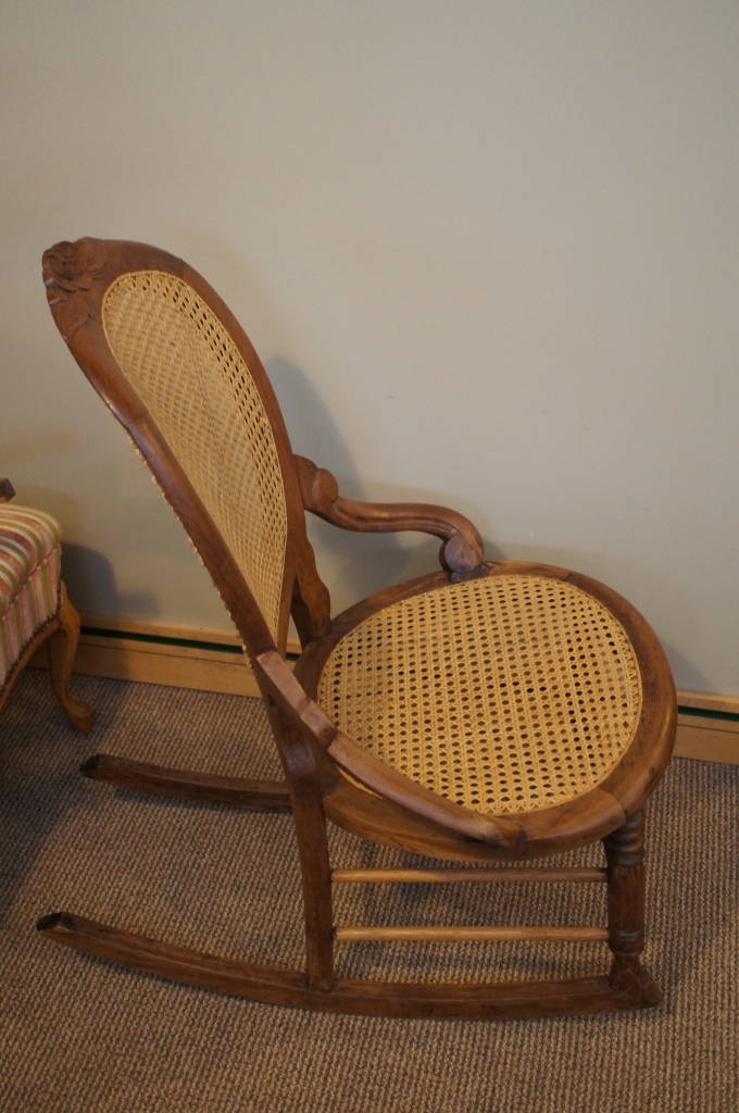Antique Caned Rocking Chair W/ Floral Carved Back & Unique Turned Legs