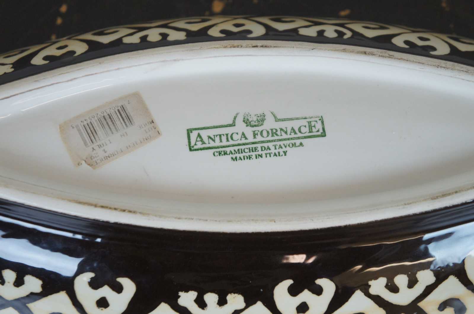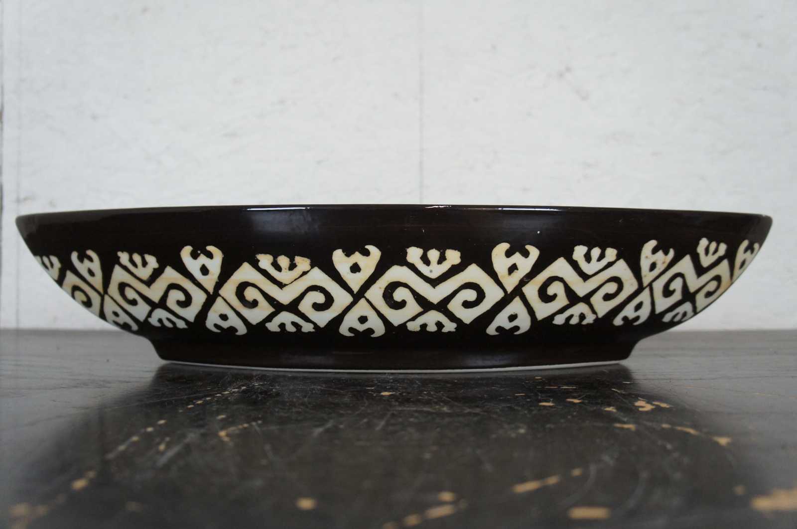 Almond/oblong shaped serving dish by Antica Fornace Italy featuring a brown and white geometric pattern.