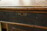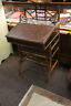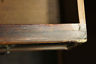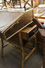 This piece has a very used look to it, some wear to the finish in spots, some minor damage to the piece itself, otherwise in excellent condition for it's age. The leather top is pealing loose in a few place, however this just lends a hand in the natural age of the piece. The back right leg is beginning to split as bamboo tends to do over time, and the connected stretcher is a little loose. This does not compromise the structural integrity of the piece and it is still very sturdy.