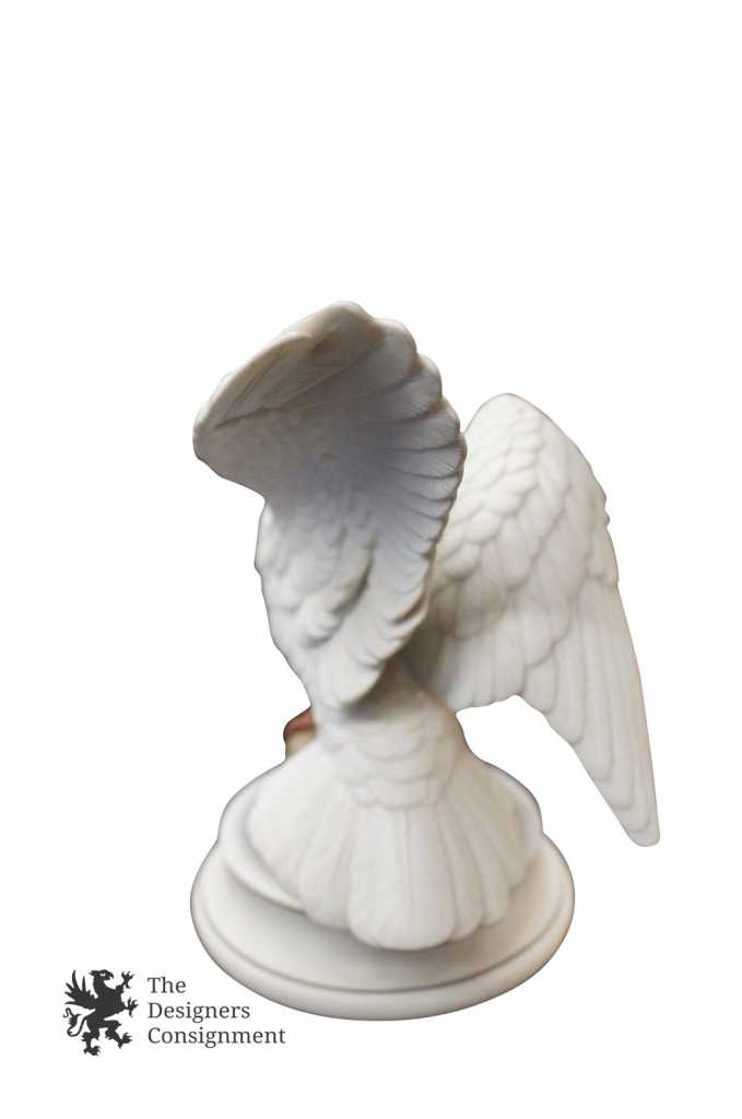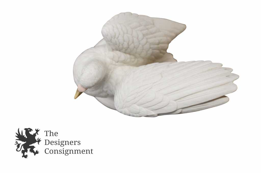 Features a porcelain dove with its wings open and standing on rocks
