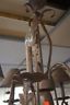 Here is a beautiful Iron Chandelier. This light features Acanthus leaves, Medal shades, and a downward facing spotlight. A great addition to any dining room.