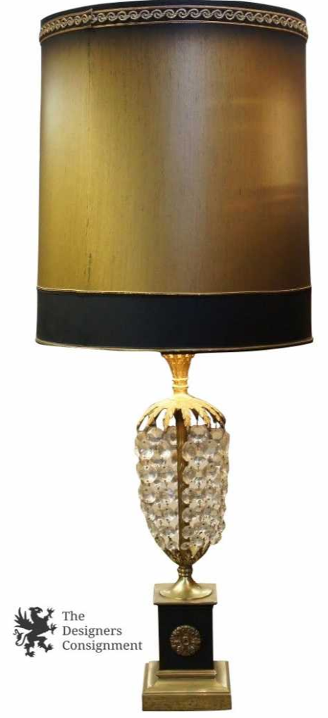 Hollywood Regency Octagon Crystal Lamp W/ Shade Twelve Point Leaf Black & Gold