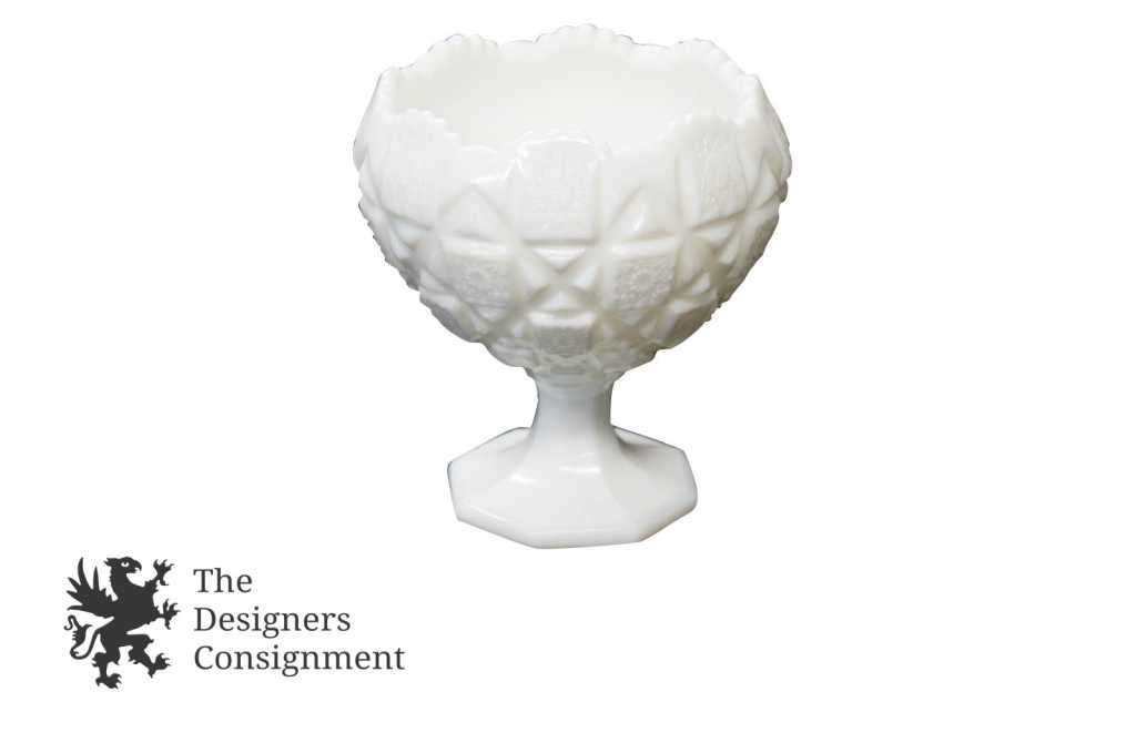 This is a great piece from the company Westmoreland. It is a vintage Milk Glass compote with Hobstar designs to it and a gorgeous white color. we believe this piece to be a part of the Old Quilt pattern. This is a beautiful piece and it would make a wonderful addition to your home or collection.