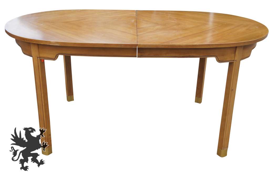 This is a beautiful mid century dining set made by Hickory Furniture Company. The chairs are a vintage teal with a wicker back, while the table is finished in an amazing geometric parquetry design. Two leaves are included. A great addition to any home.