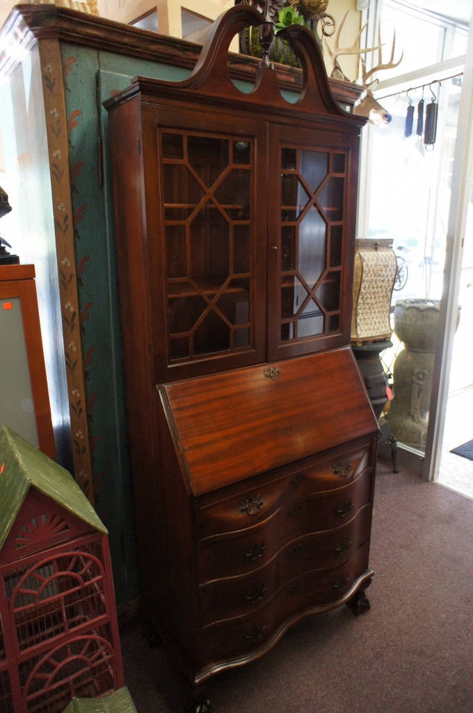 Antique Drop Front Secretary Ox Bow Curved Drawers Glass Door Display Cabinet
