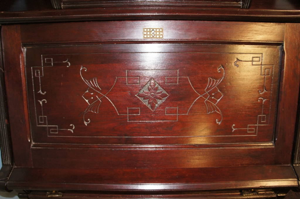 Antique 19th Century Carved Secretary W/ Wooden Casters & Beveled Vanity Mirror