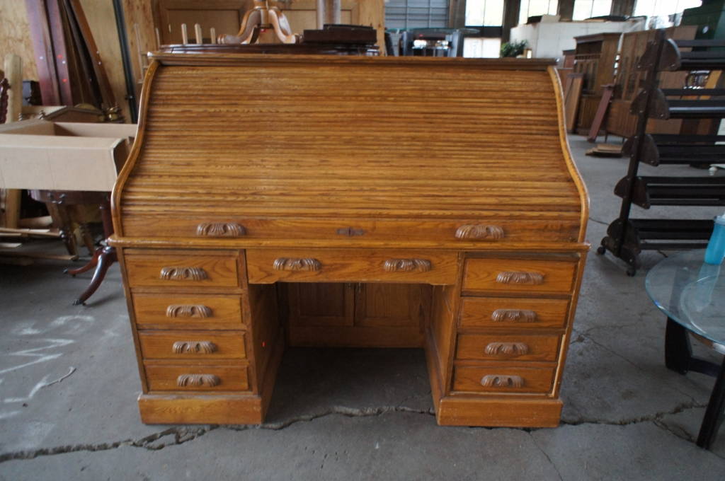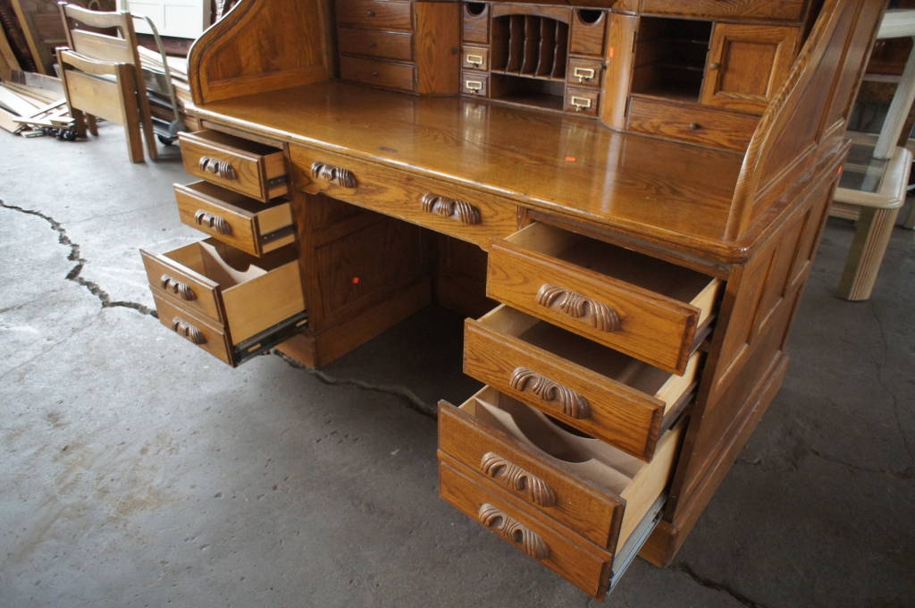 Large Oak Serpentine Roll Top Office Desk w/ Lots Of Compartments 64.5" Tall