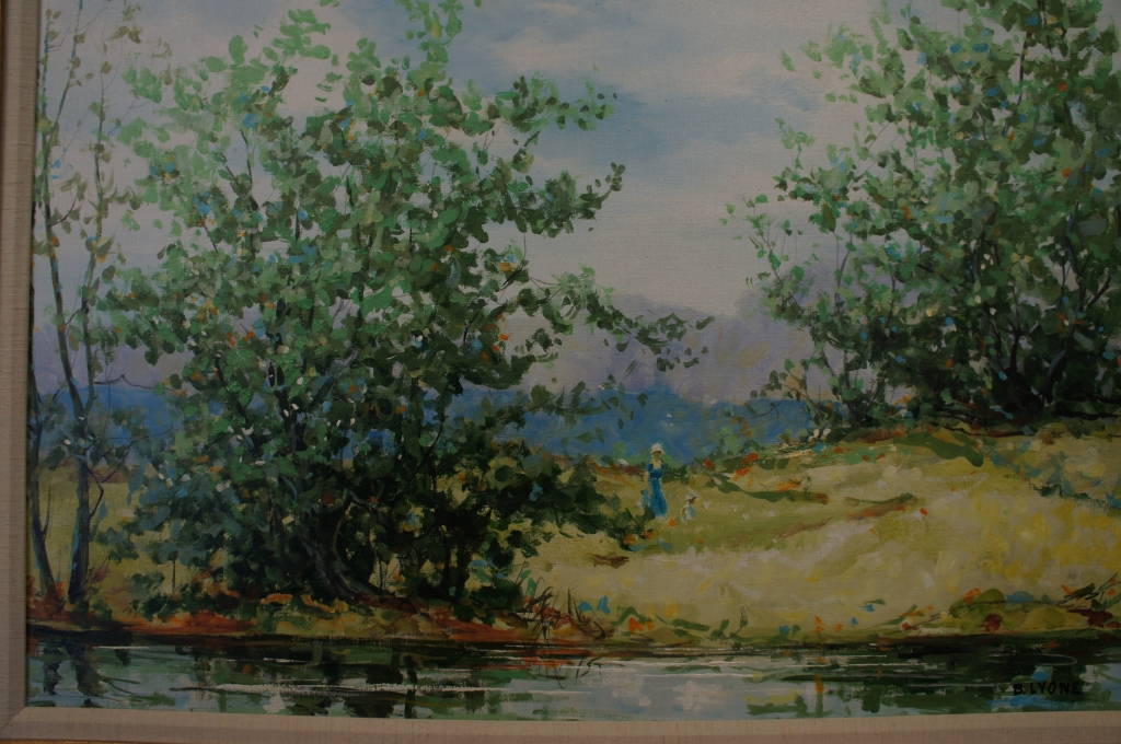B. Lyone Large Oil Landscape With Gilded Frame Signed Prairie Woods Paris France