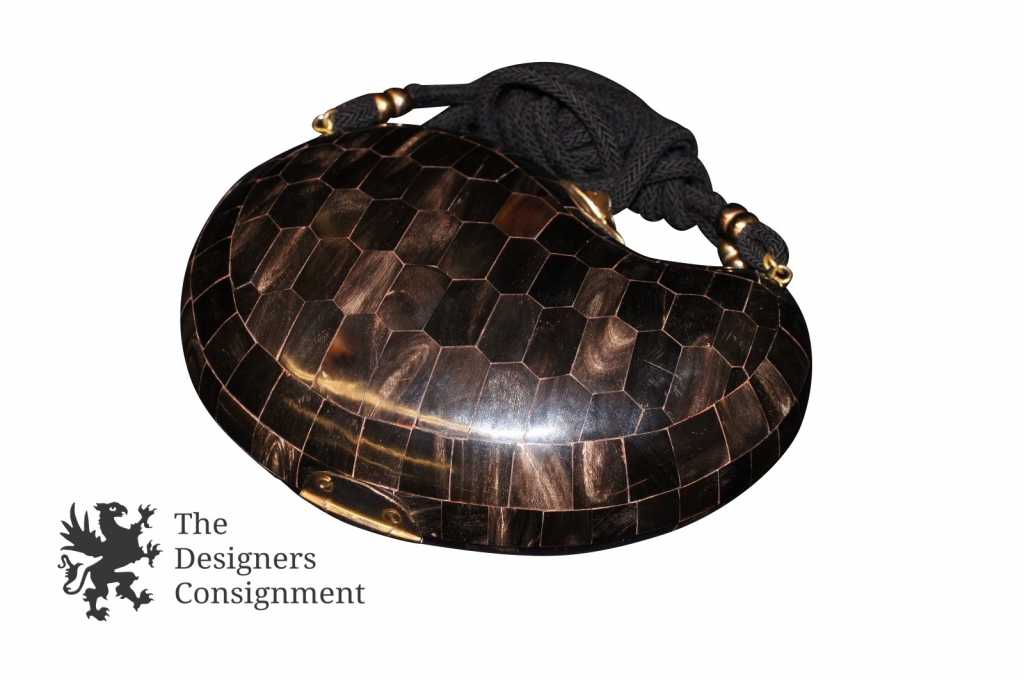 This is a gorgeous piece . It is a paisley shaped purse and the exterior looks like it is made of tortoise and this piece comes with a pink dust cover bag. This is an absolutely beautiful piece and it would make a wonderful addition to your home or collection.