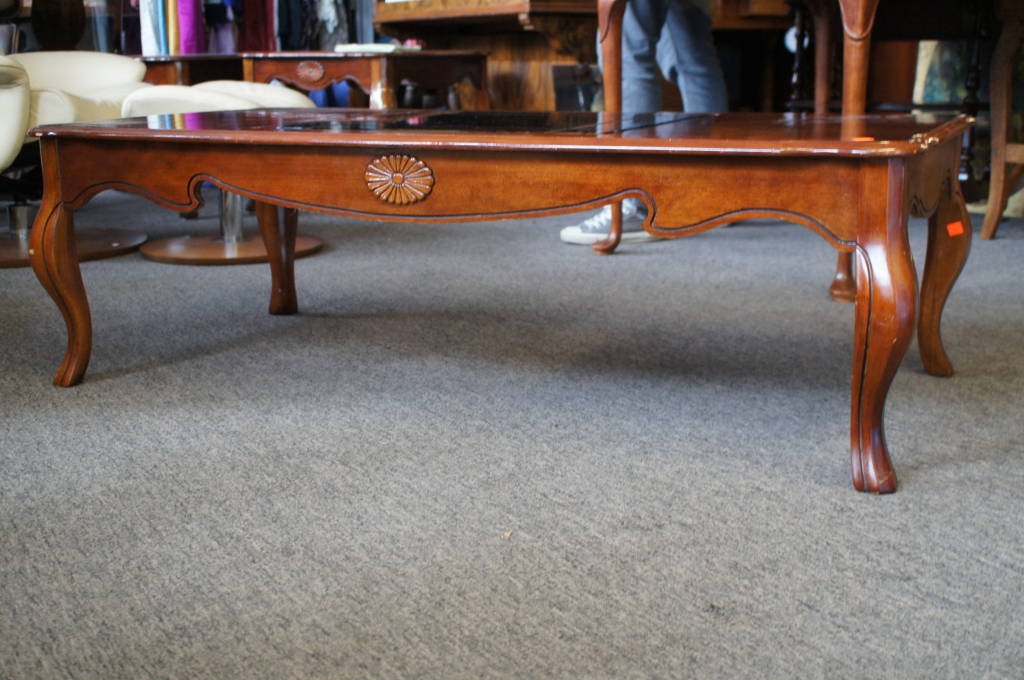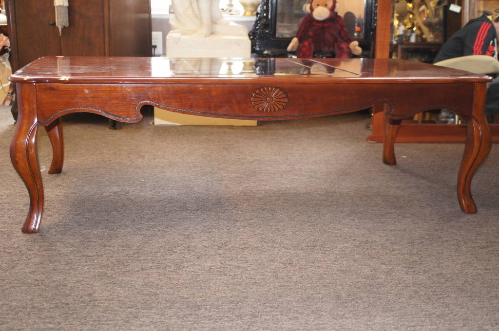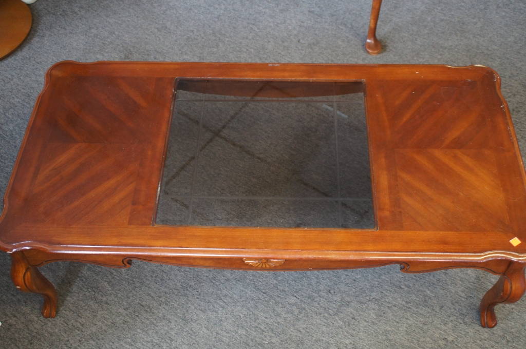 Vintage Cherry Coffee Table Parquetry Top & Smoked Glass Cabriole Legs Scalloped Accents, ACCT CLOSED 1.4.17