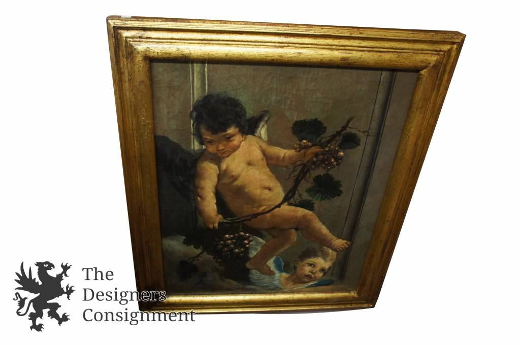 Trevor James Co. Putto Sheaf W/ Wheat Large Oil On Canvas Cherub Artwork Grapes