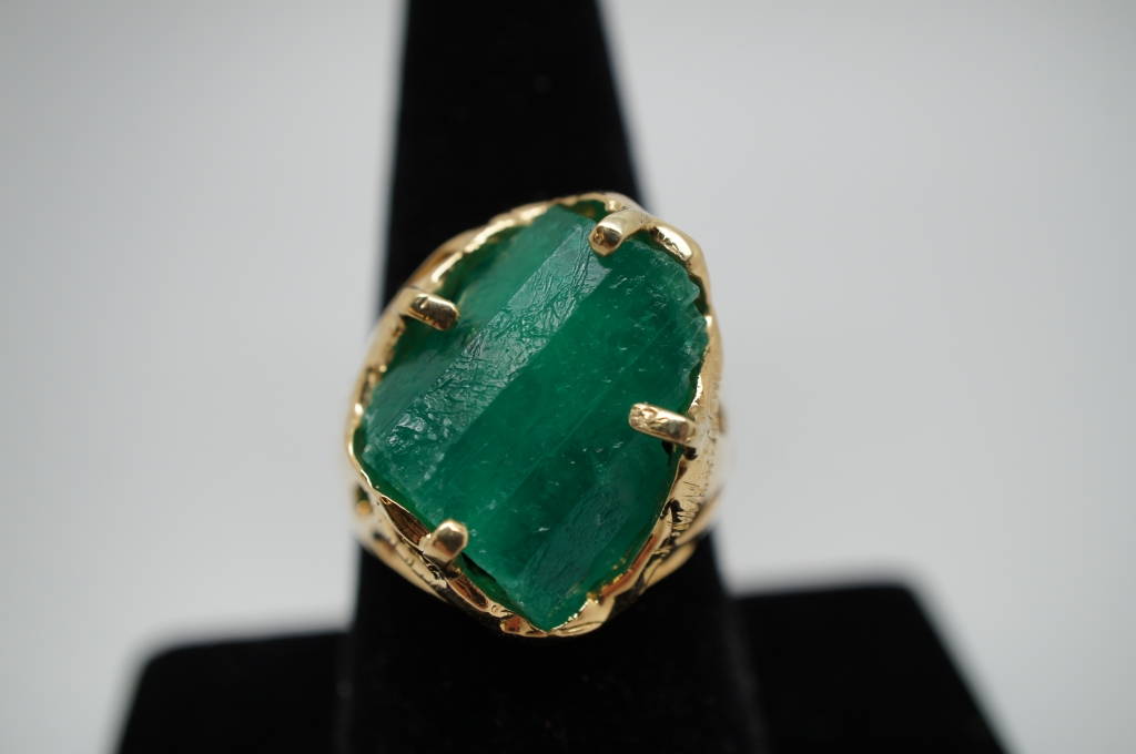 Natural Rare 18K Yellow Gold Blue Green Rough Freeform Emerald Ring 14.10 Grams - removed